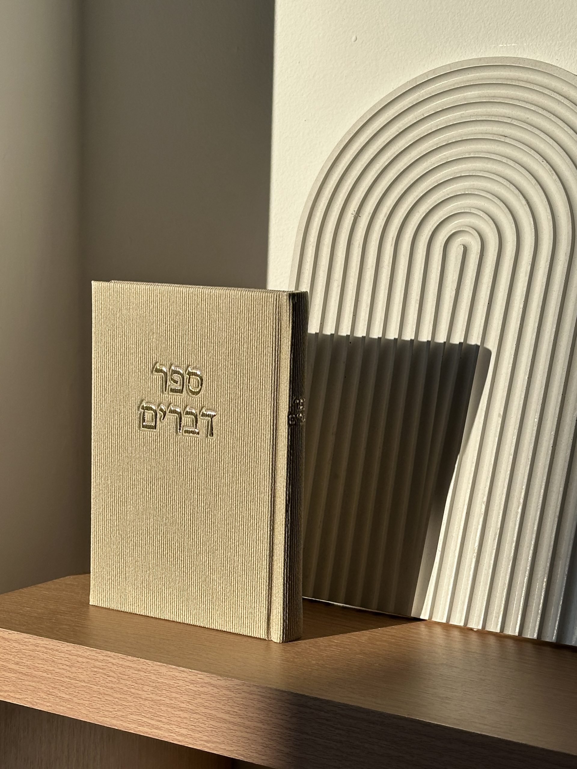 ספר דברים , גוון חול + כיתוב זהב , גובה 17.5 ס”מ , רוחב 12.5 ס”מ .