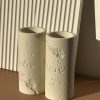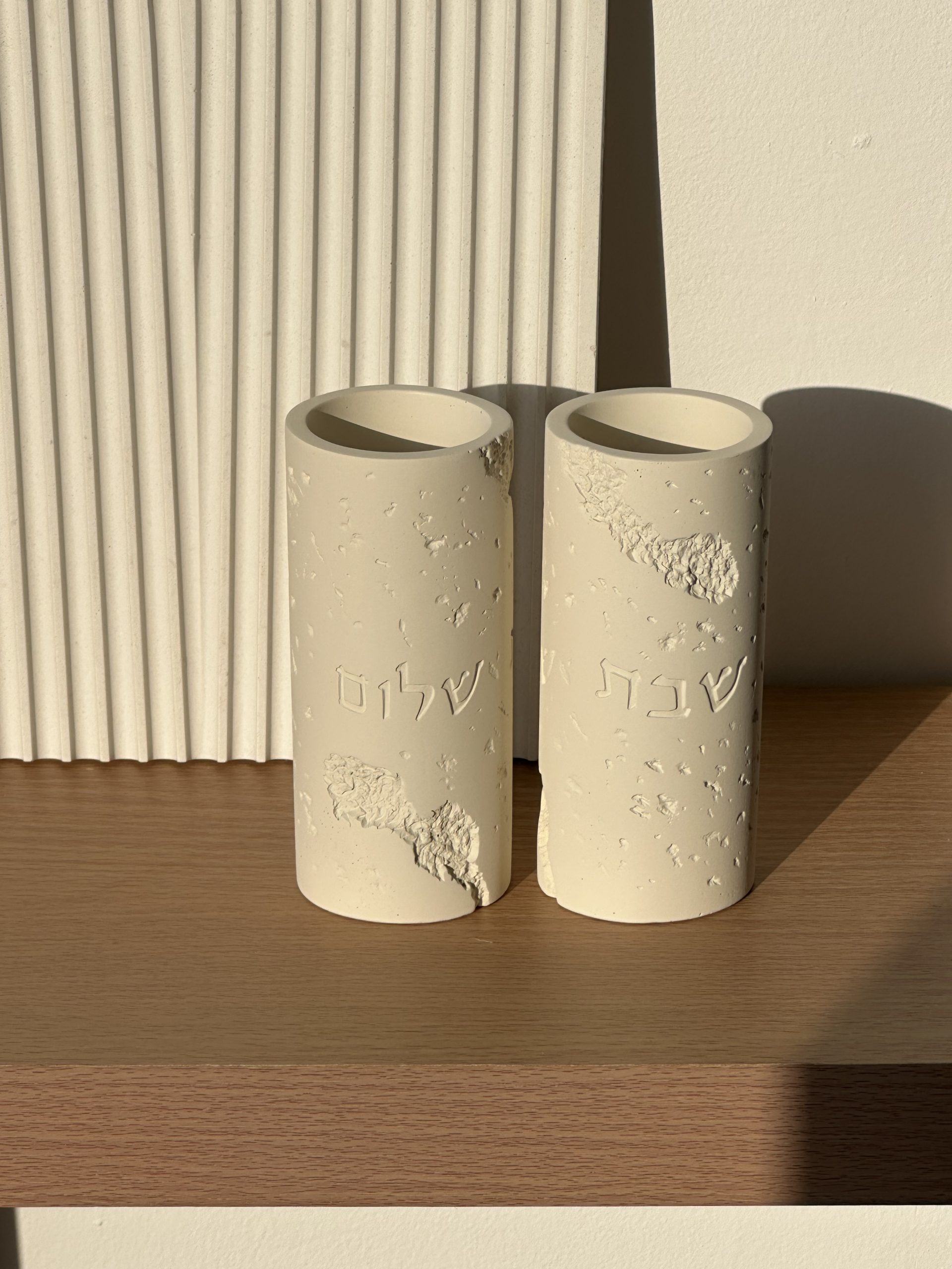 פמוטים לשבת מבטון ״ שבת שלום ״ גוון שמנת , גובה 12 ס”מ .