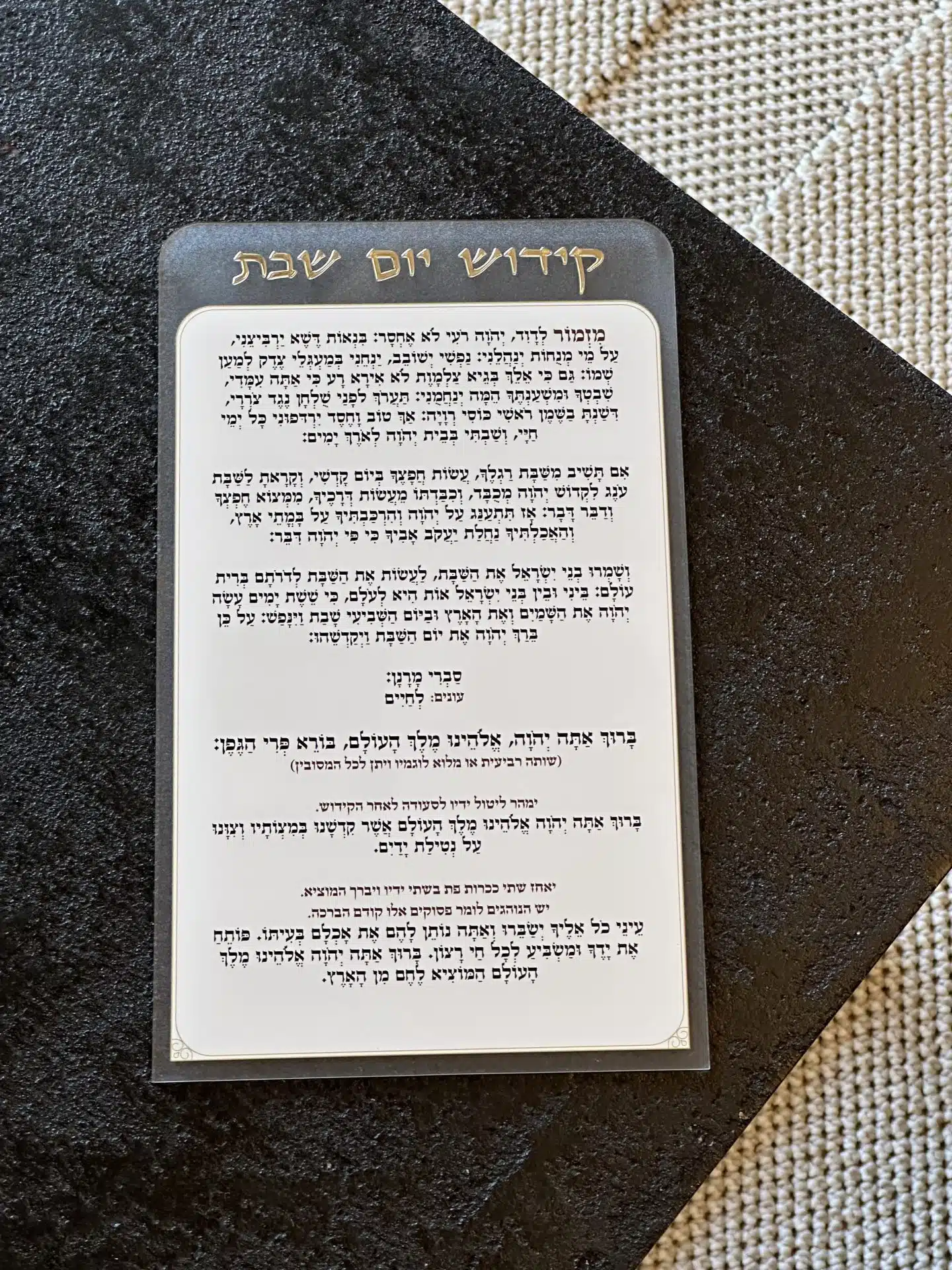 קידוש יום שבת מפרספקס , נוסח עדות המזרח , אורך 25 ס״מ , רוחב 15 ס״מ .